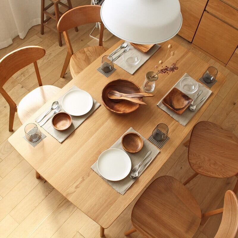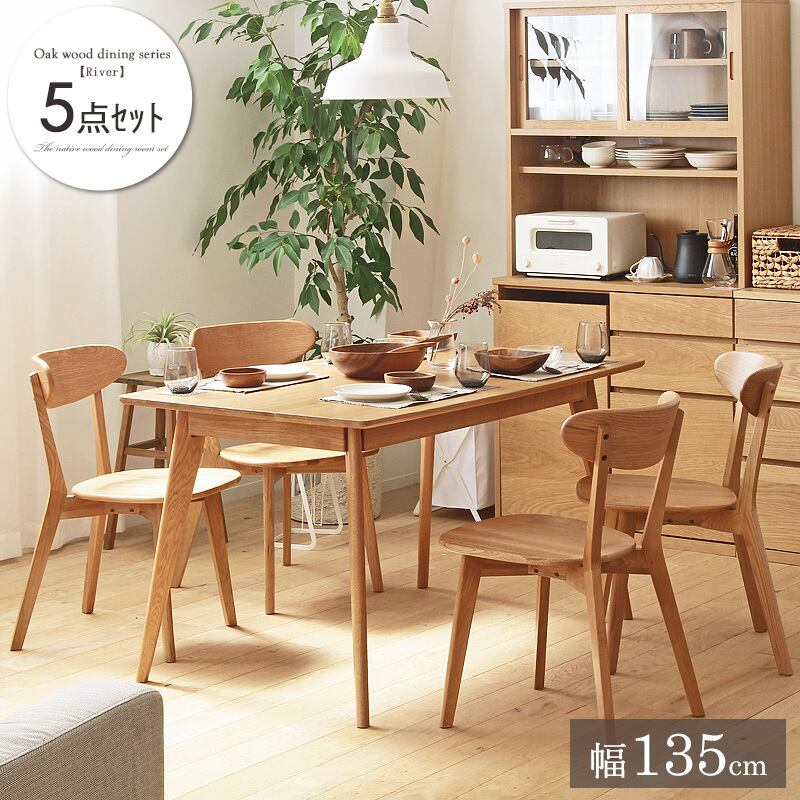 ぬくもりのある木の暮らしを演出するセット 天然木オークをふんだんに使用した「リバー」ダイニング家具シリーズは、温かみのあるダイニング空間を作り出します。