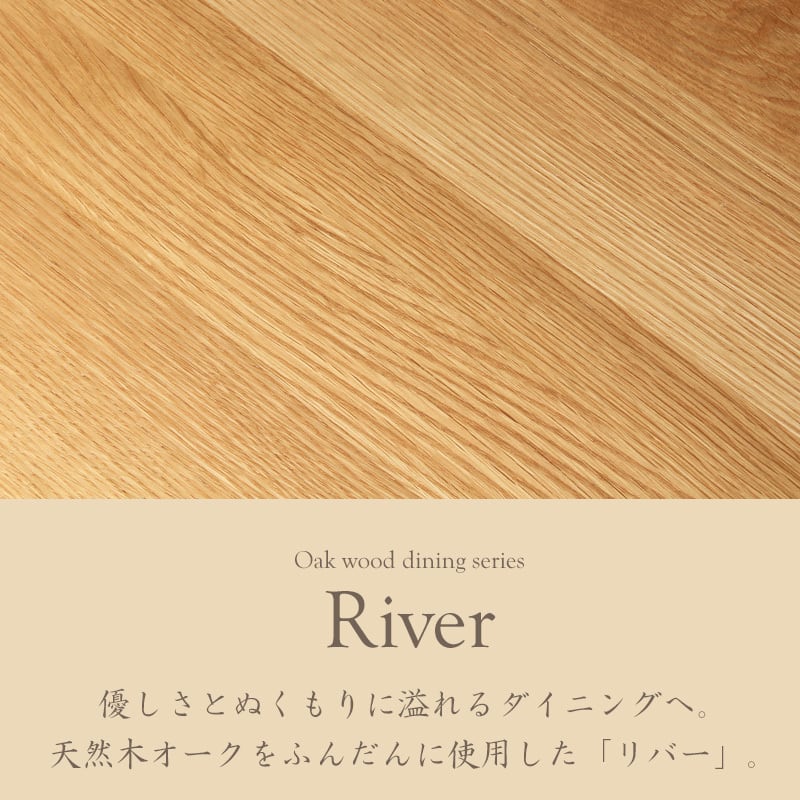天然木オークを使用したダイニング家具『リバー』シリーズ。美しい木目と温もりあるデザインで、家族と共に長く使えるシンプルな一台を。