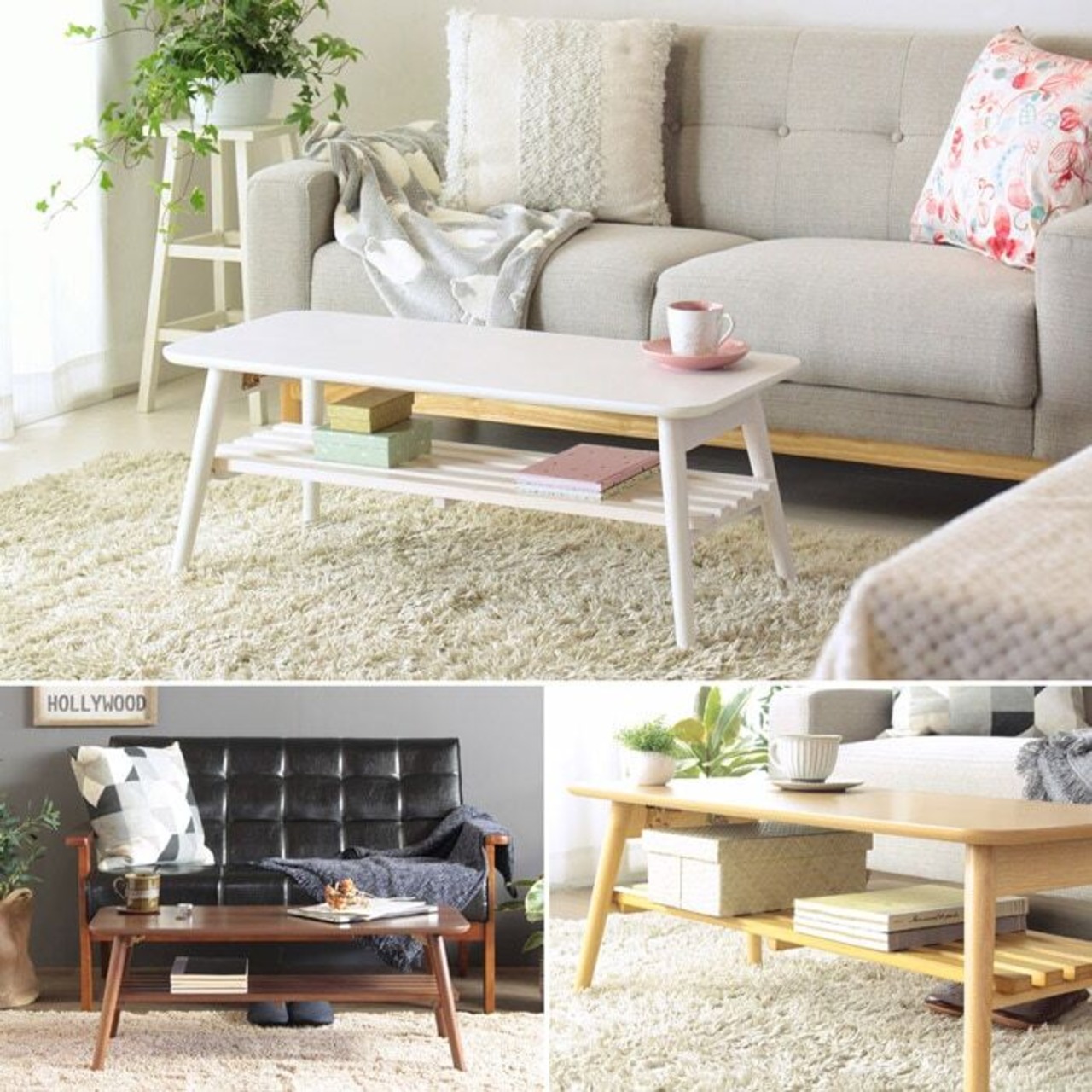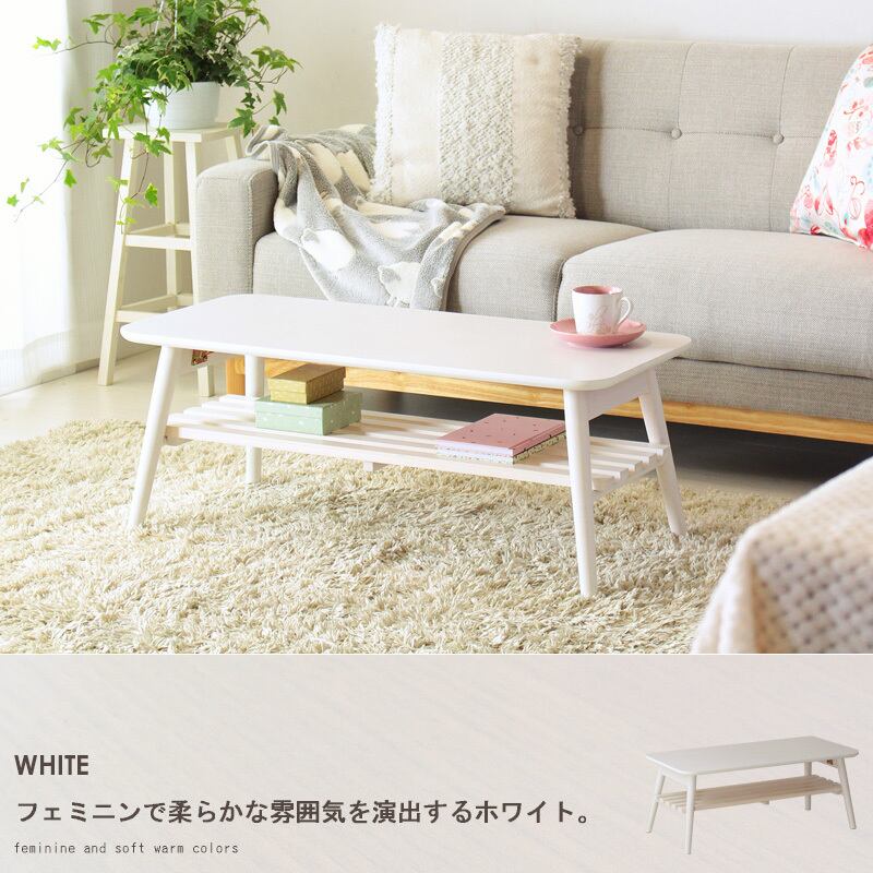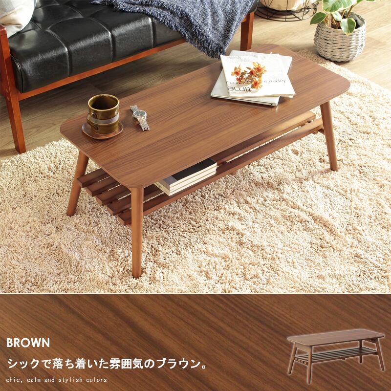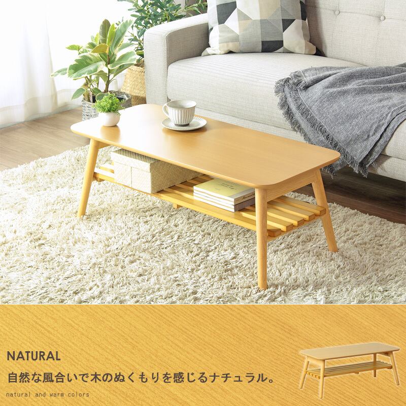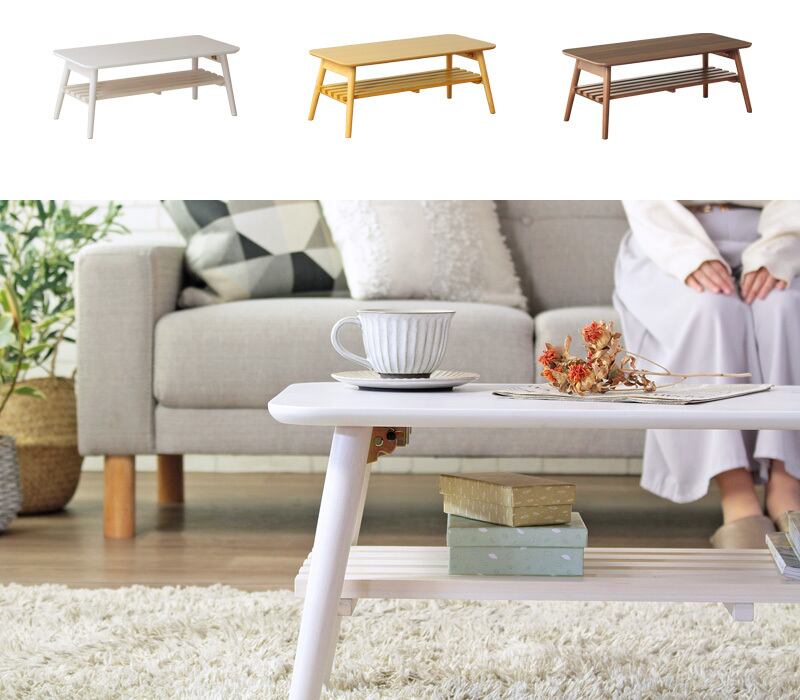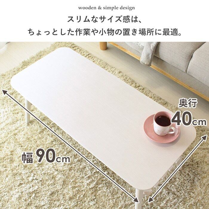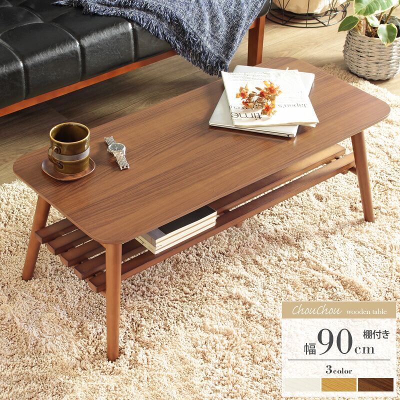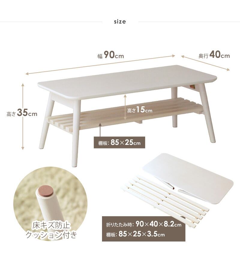 天板サイズは90×40cmで圧迫感がなく、リモコンや雑誌が収納できる棚付きタイプなので、テーブル周りもスッキリ。