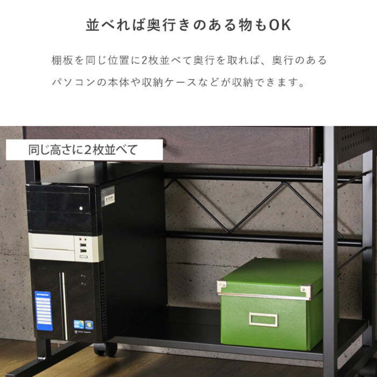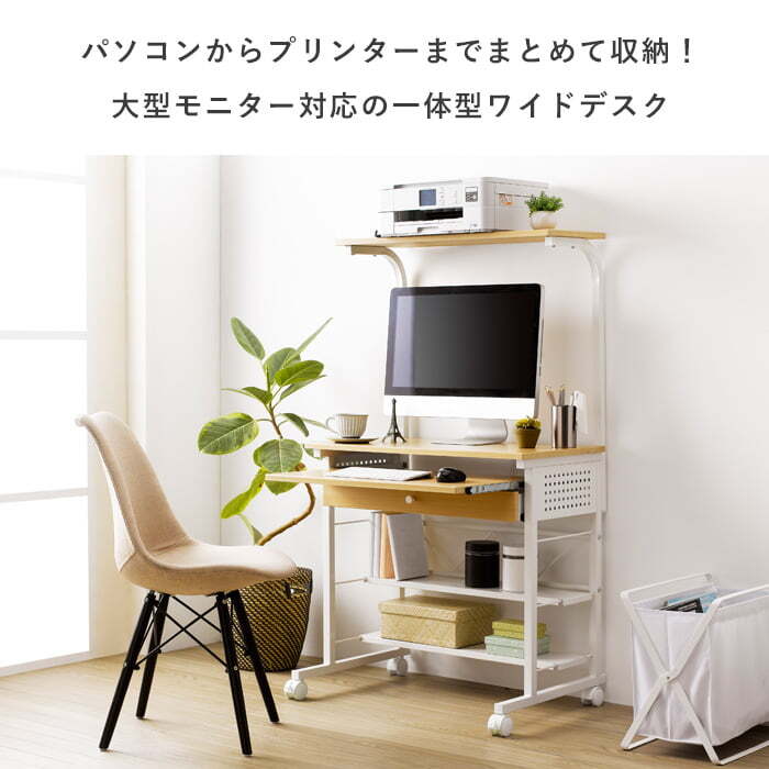 上棚はプリンタを置くのに最適で、下棚は棚の位置を調整することで様々な物の収納が可能です。