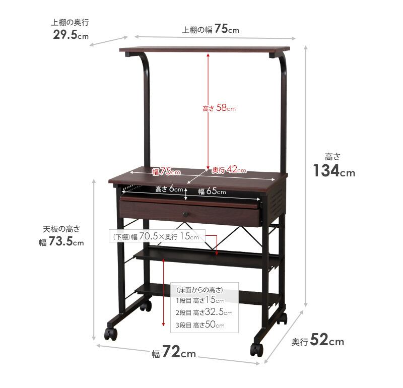 サイズ 本体:幅75×奥行52×高さ134cm(天板高さ73.5cm)