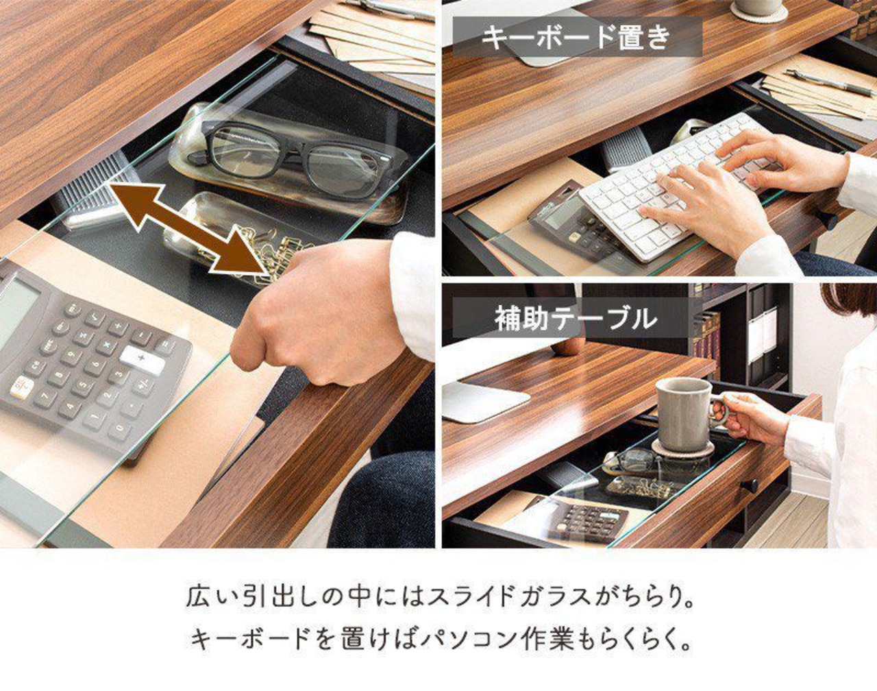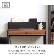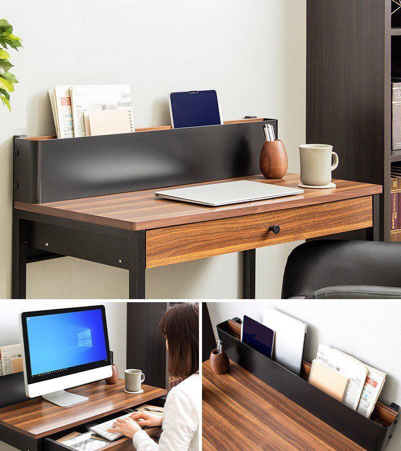 幅85cmで省スペースでも使用できるサイズ感は、引き出しとブックシェルフを備え、雑貨や小物、A4サイズよりも大きな雑誌やノートパソコン、タブレットをおしゃれに収納できます。