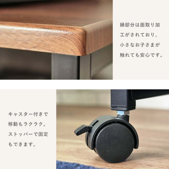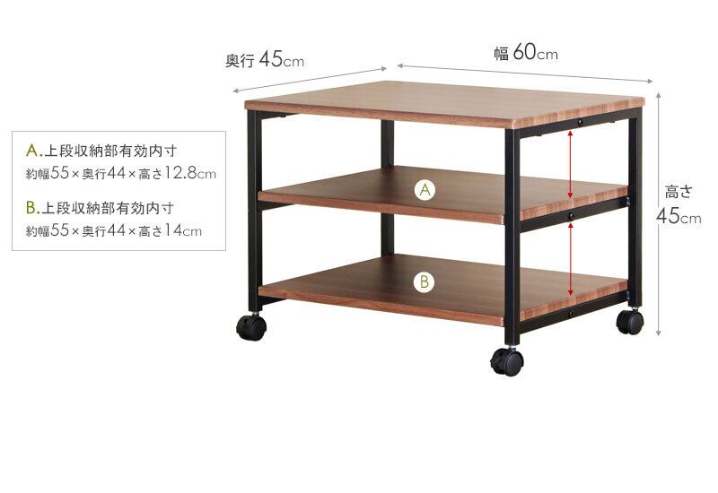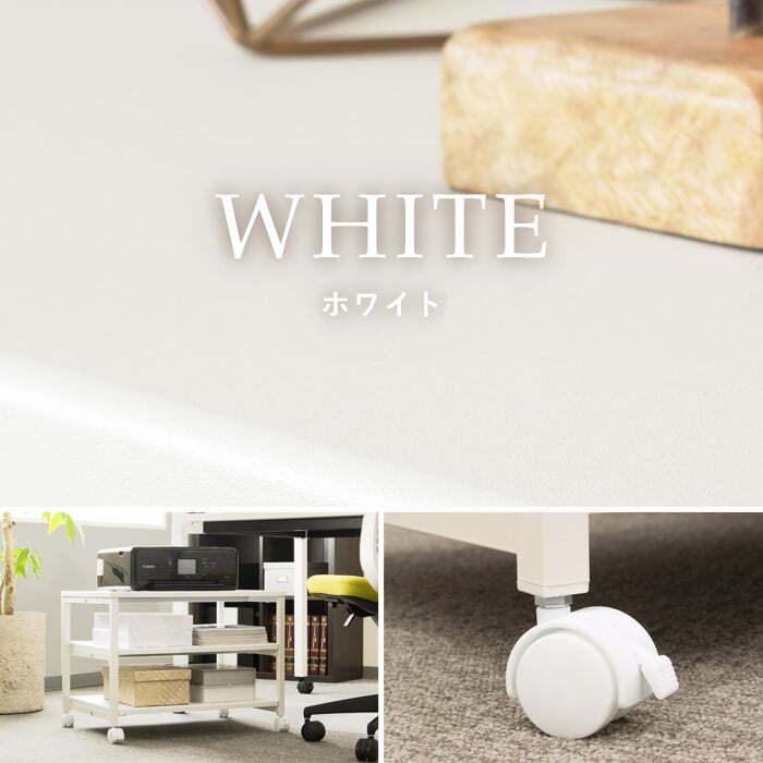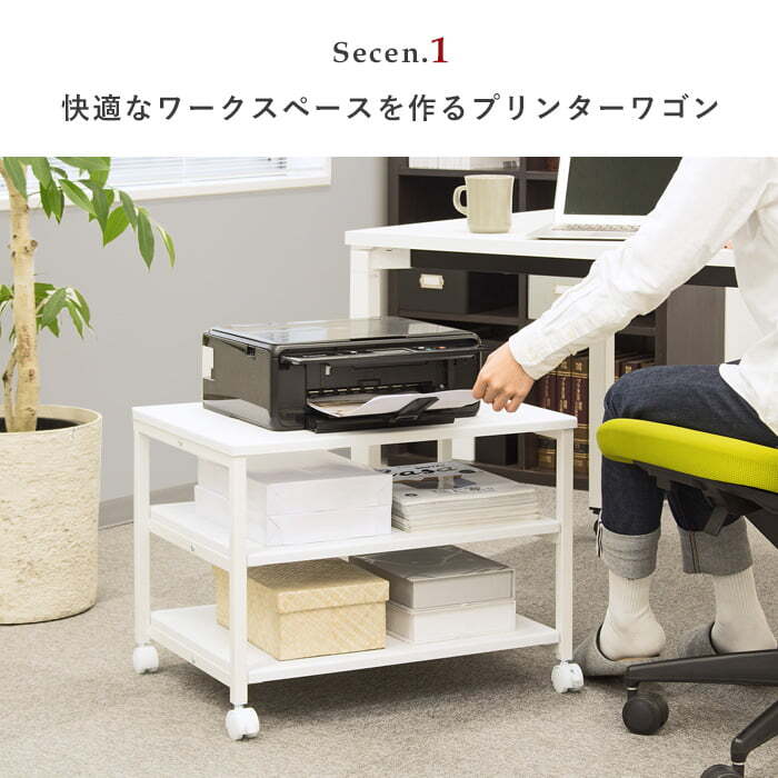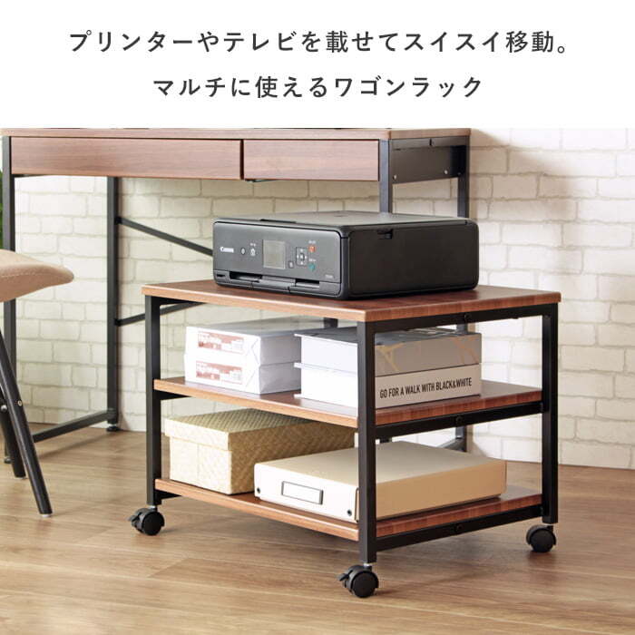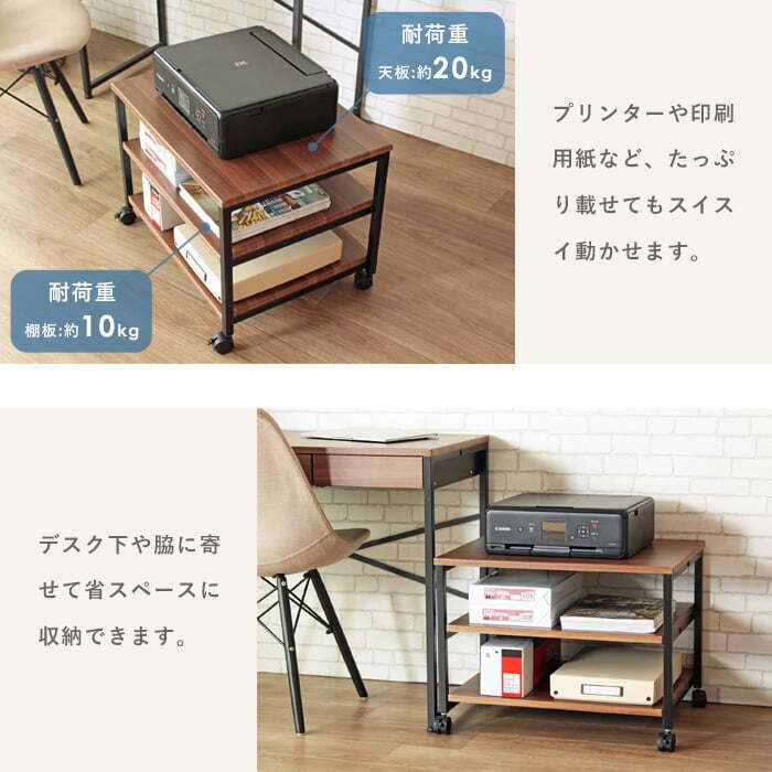 プリンターや用紙、小物などの収納に大活躍します。キャスター付きで、デスクの横にも下にもスムーズに移動でき、快適に使用できます。