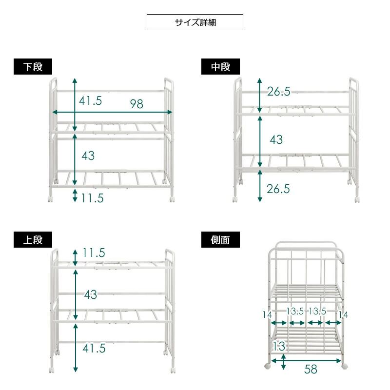 棚位置は3段階で調節可能、下に衣装ケースや収納ボックスを置けます。
