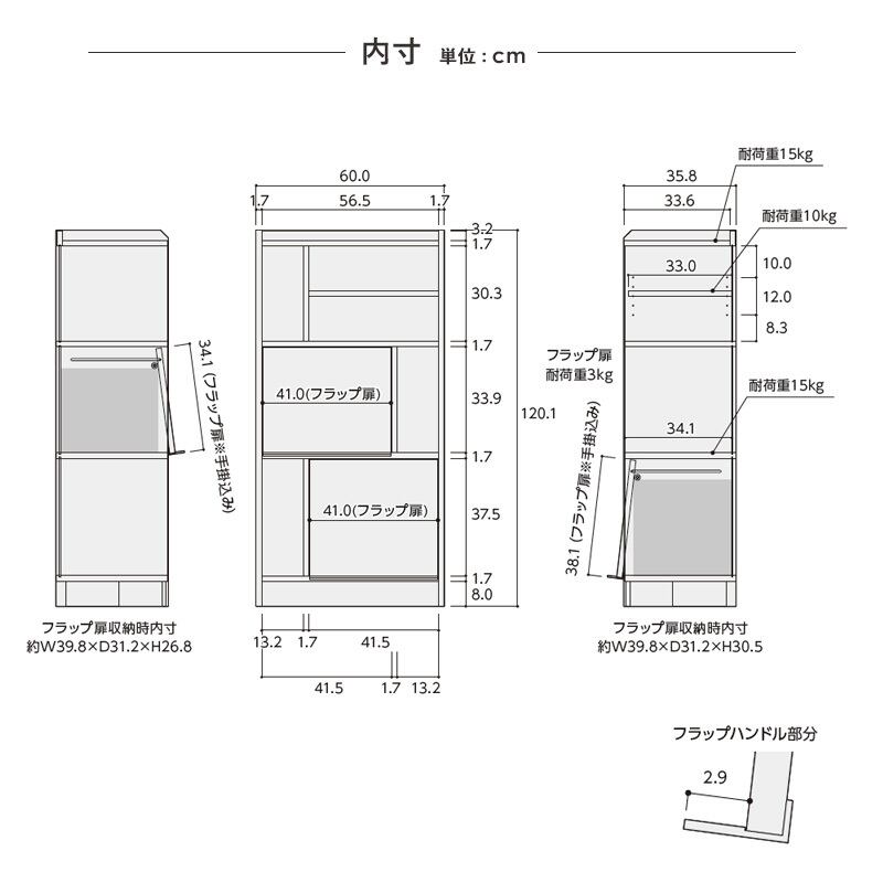 耐荷重:天板15kg、棚板15kg、移動棚10kg、フラップ扉3kg