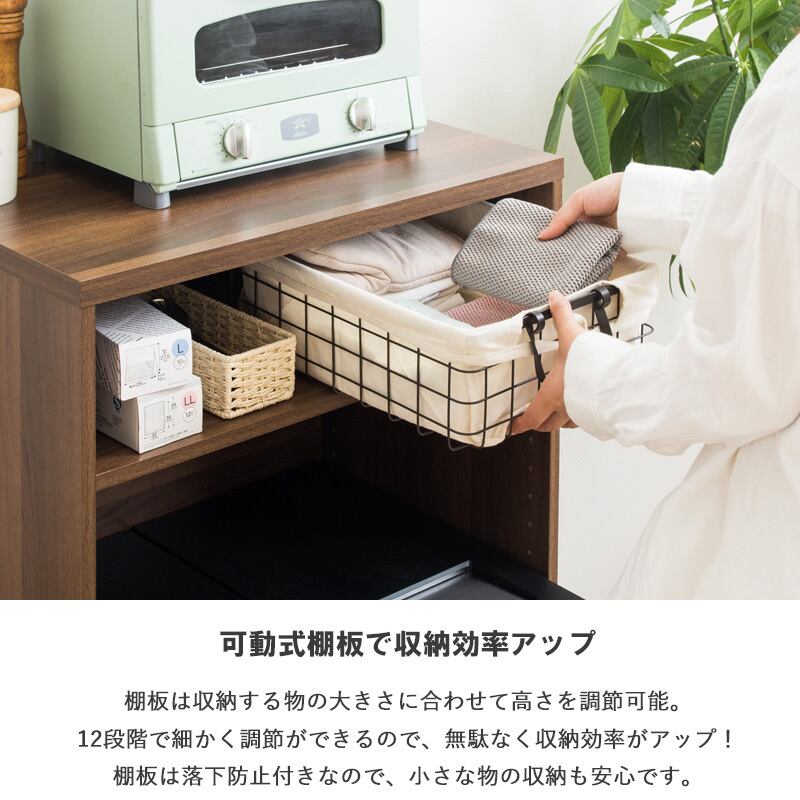 天板の上には家電などを、天板の下には小物が収納できる可動棚付きで、一人暮らしや狭いキッチンにも最適です。
