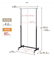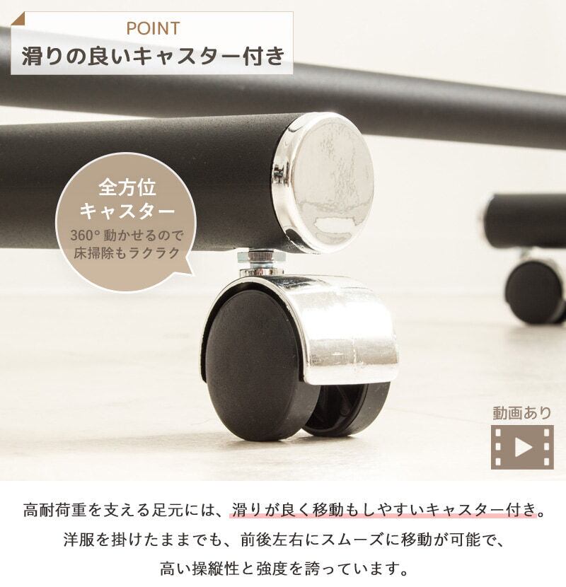 80kgの耐荷重で、冬物も余裕をもって収納。強度高いスチールパイプと安定した構造で、長く使える安心感。家庭用から業務用まで対応するシンプルで高品質なデザイン。