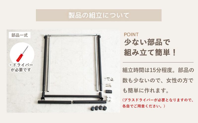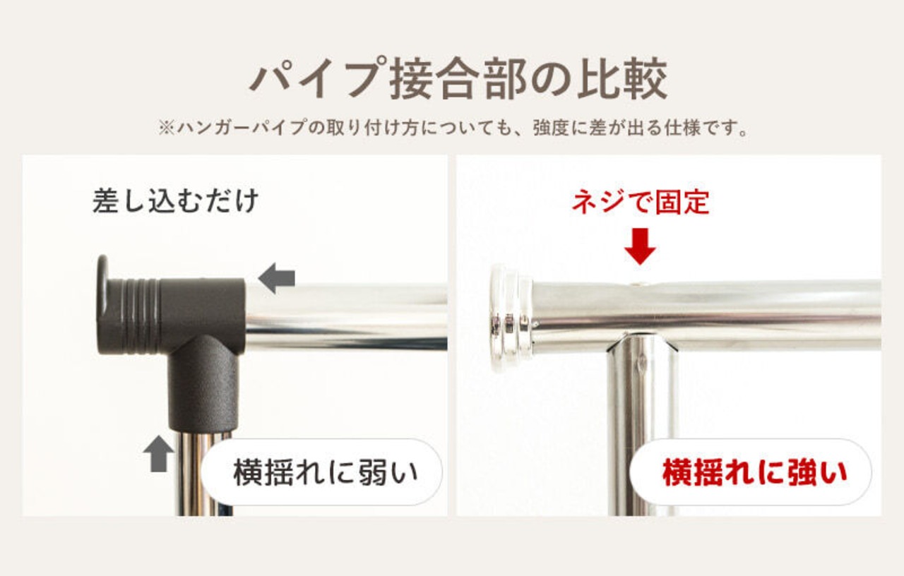 高強度のスチールパイプと、しっかりとした支え構造で、耐荷重80kgを実現したパイプハンガー。