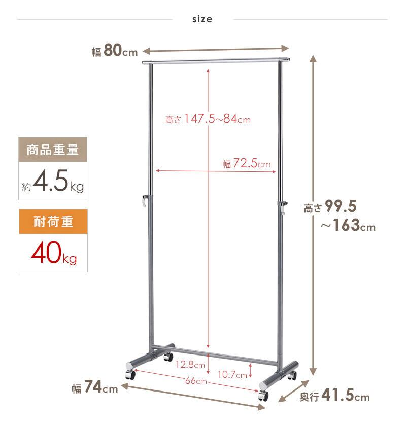 ハンガーラック キャスター付き 伸縮 スリム おしゃれ 省スペース 幅80 伸縮可能 シンプル 頑丈 耐荷重40kg 衣類ハンガー