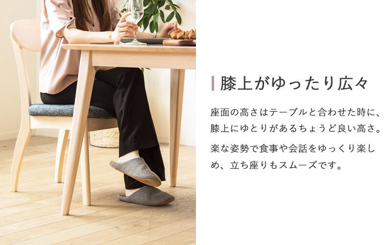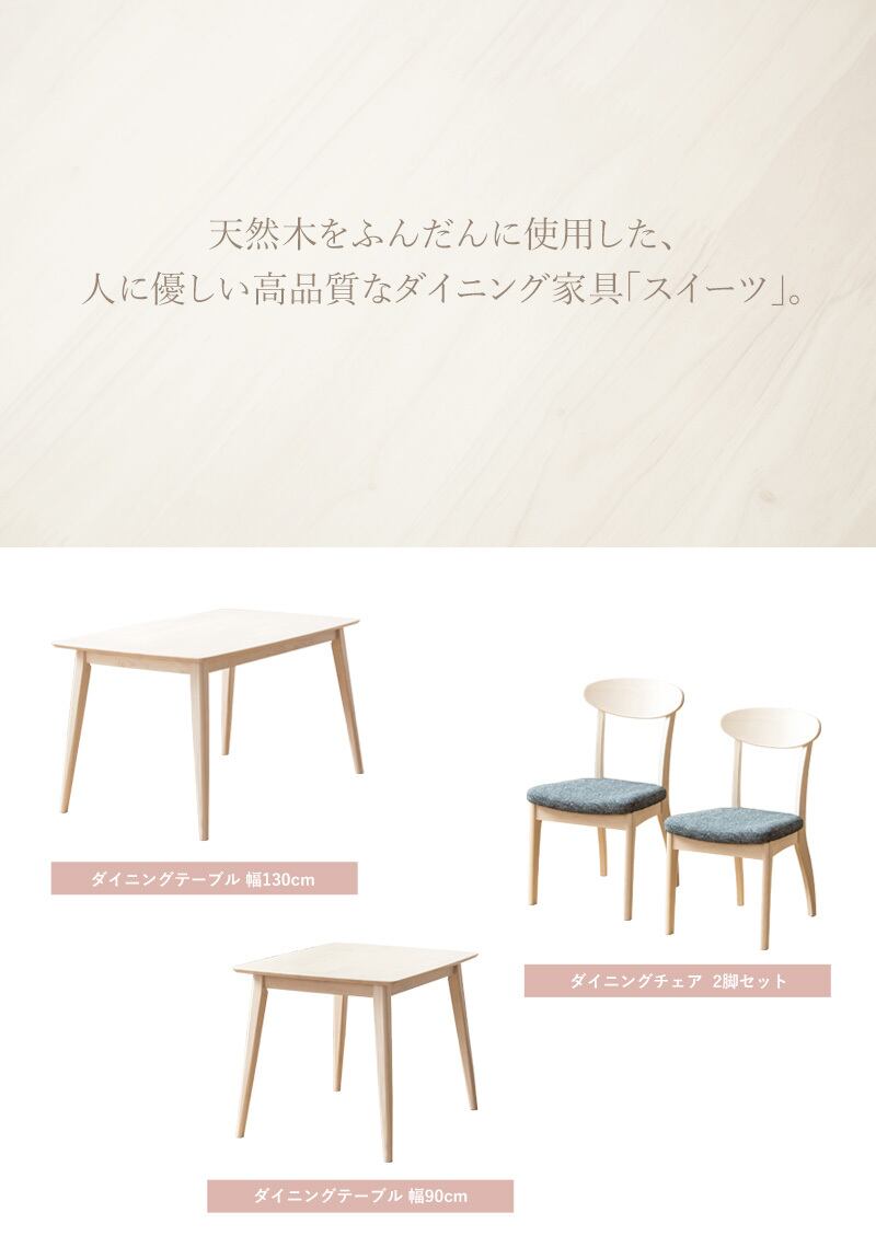 天然木ラバーウッドを贅沢に使用したダイニングシリーズ「スイーツ」。美しい木目と優しい手触りで、特別な食卓を演出します。低ホルムアルデヒド仕様で、安全に長く使える、安心の一台です。