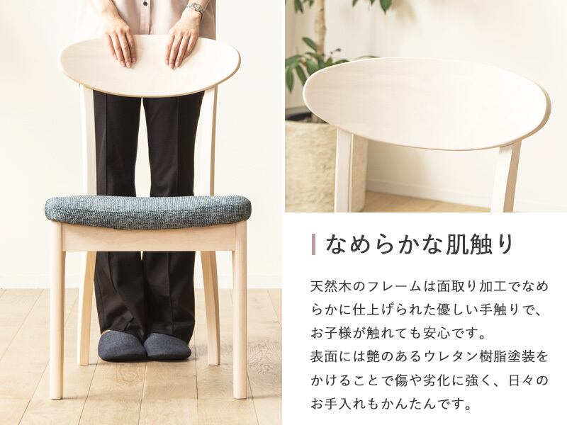 天然木ラバーウッドをふんだんに使用しておりますが、 木目の綺麗な質の良い材料を用い、 角部分の面取り加工や表面をウレタン樹脂塗装で仕上げることで、人に優しいなめらかな手触りを実現。