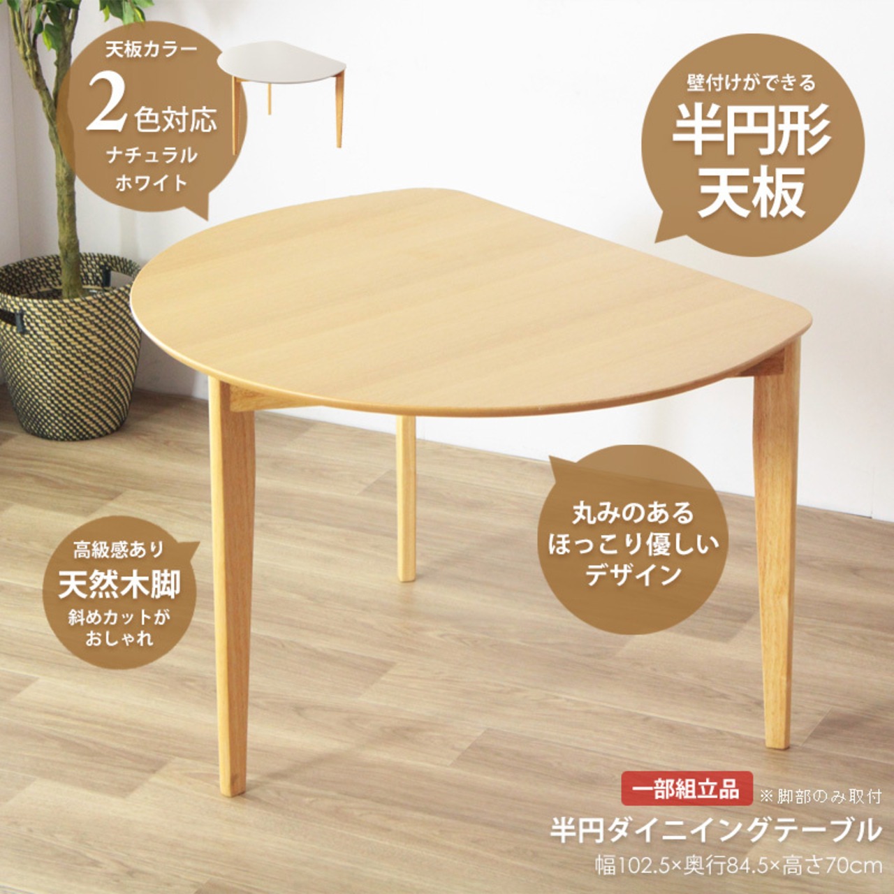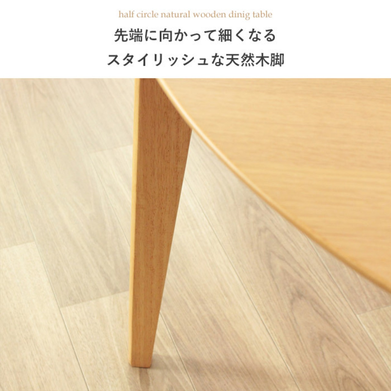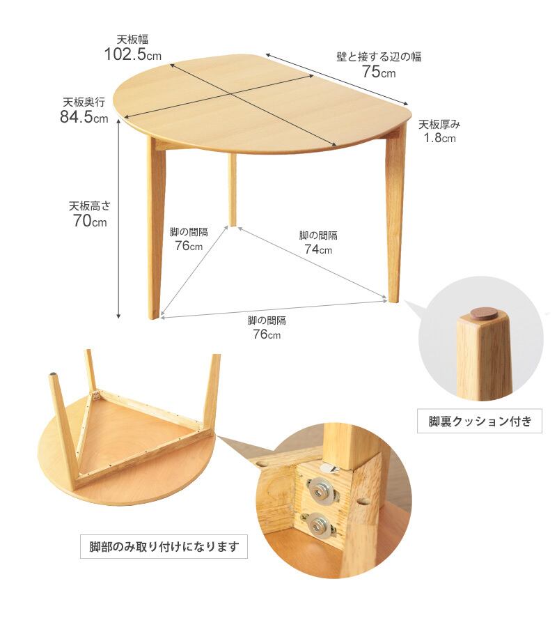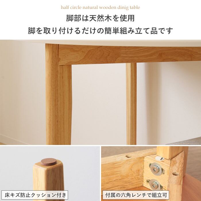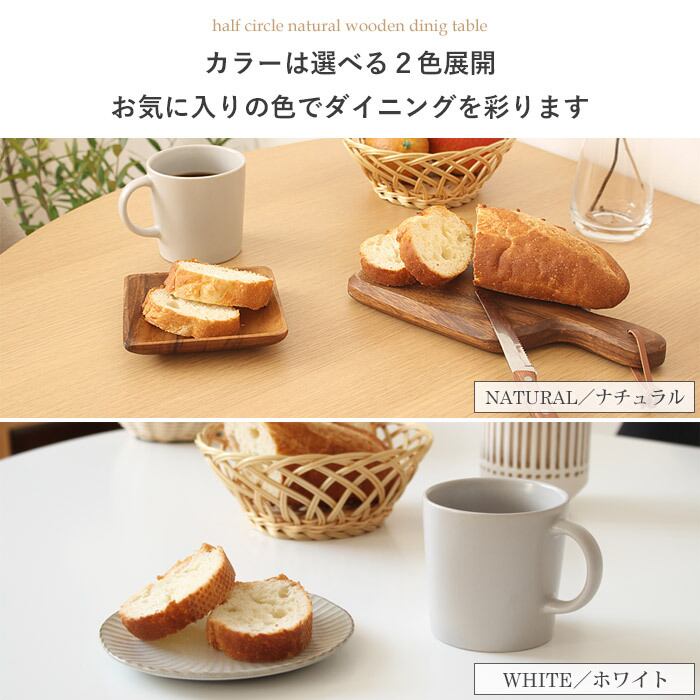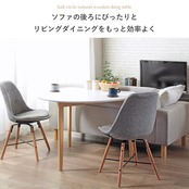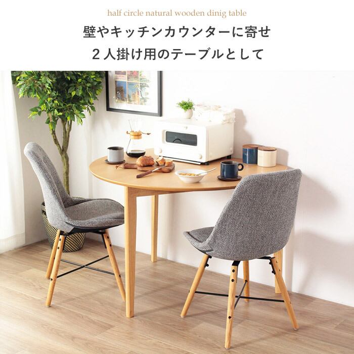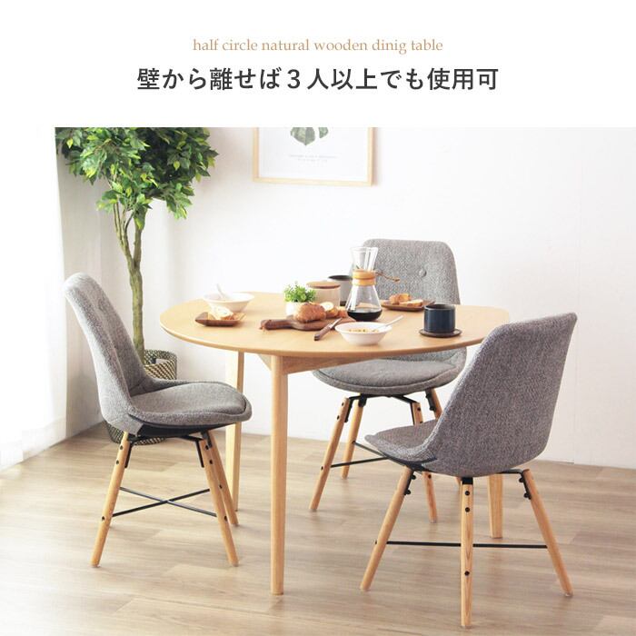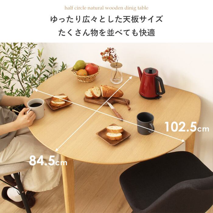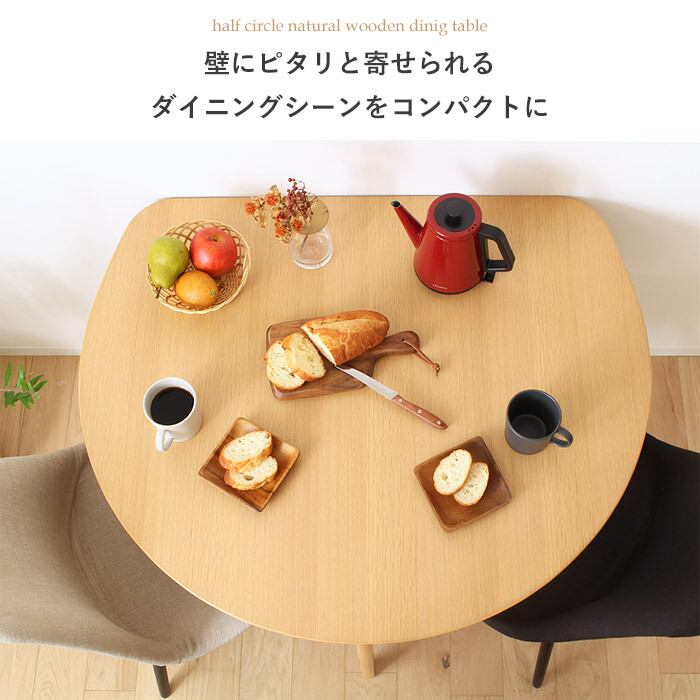 半円デザインでお部屋を広く活用!ナチュラルな風合いとコンパクトな配置が魅力のダイニングテーブル。