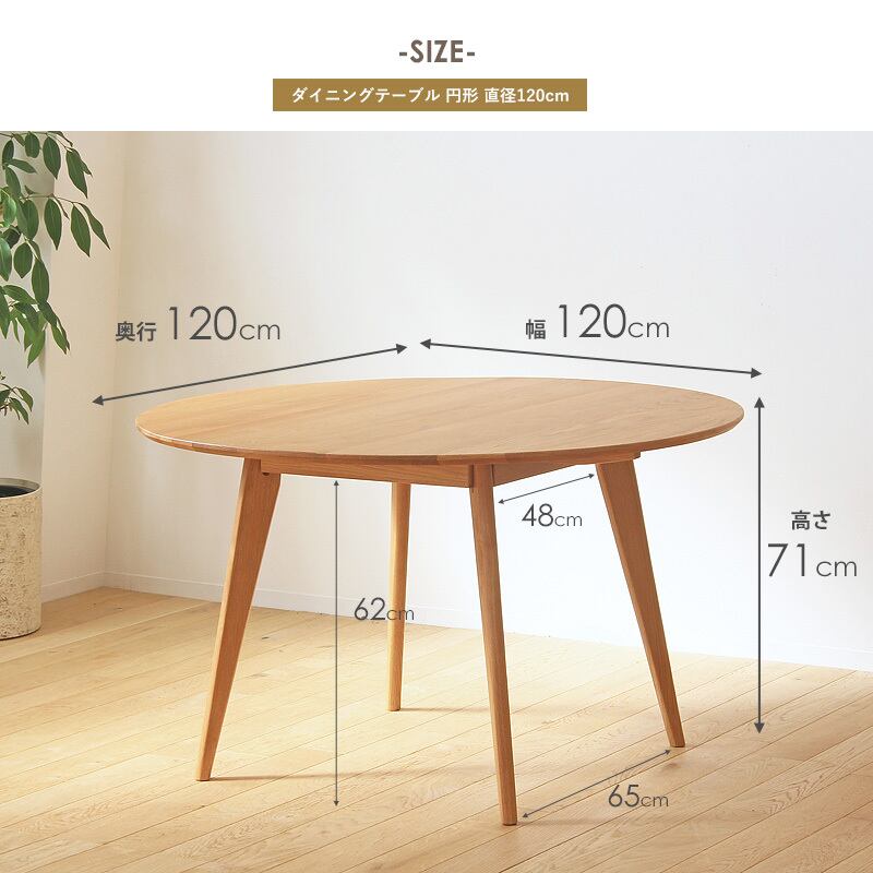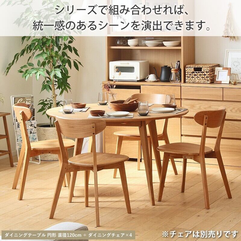 直径120cmの天板は、2~4人掛けにぴったりのサイズで、食事や会話を一層楽しいひとときにしてくれます。 丸いフォルムが柔らかい印象を与え、ダイニング空間を和やかな雰囲気に包み込みます。