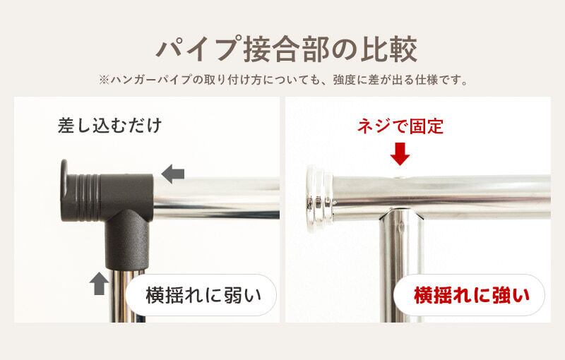 高強度のスチールパイプと、しっかりとした支え構造で、耐荷重80kgを実現したパイプハンガー。