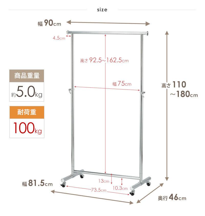 ハンガーラック スリム 頑丈 耐荷重100kg 省スペース 幅90 伸縮可能 キャスター付き 業務用 壊れない 衣類ハンガー
