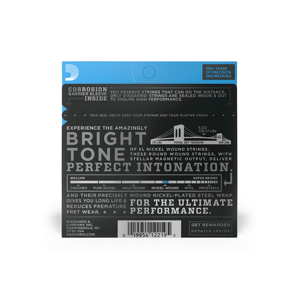 高炭素鋼の芯線とニッケルメッキ鋼の巻き線で作られたXLニッケル弦は、明るく汎用性の高いトーンを持ち、幅広い音楽スタイルに最適です。