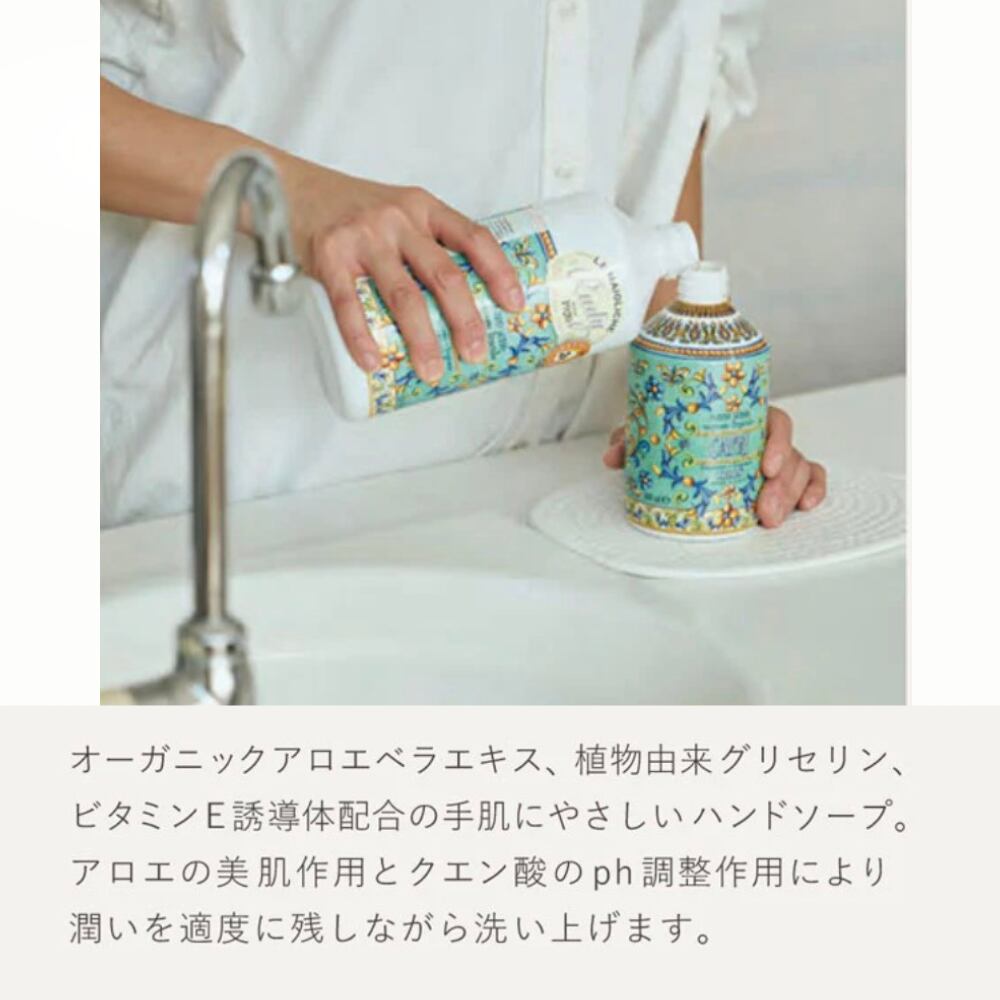 オーガニックアロエベラエキス、植物由来グリセリン、ビタミンE誘導体配合の何度洗っても手肌に優しいハンドソープ。